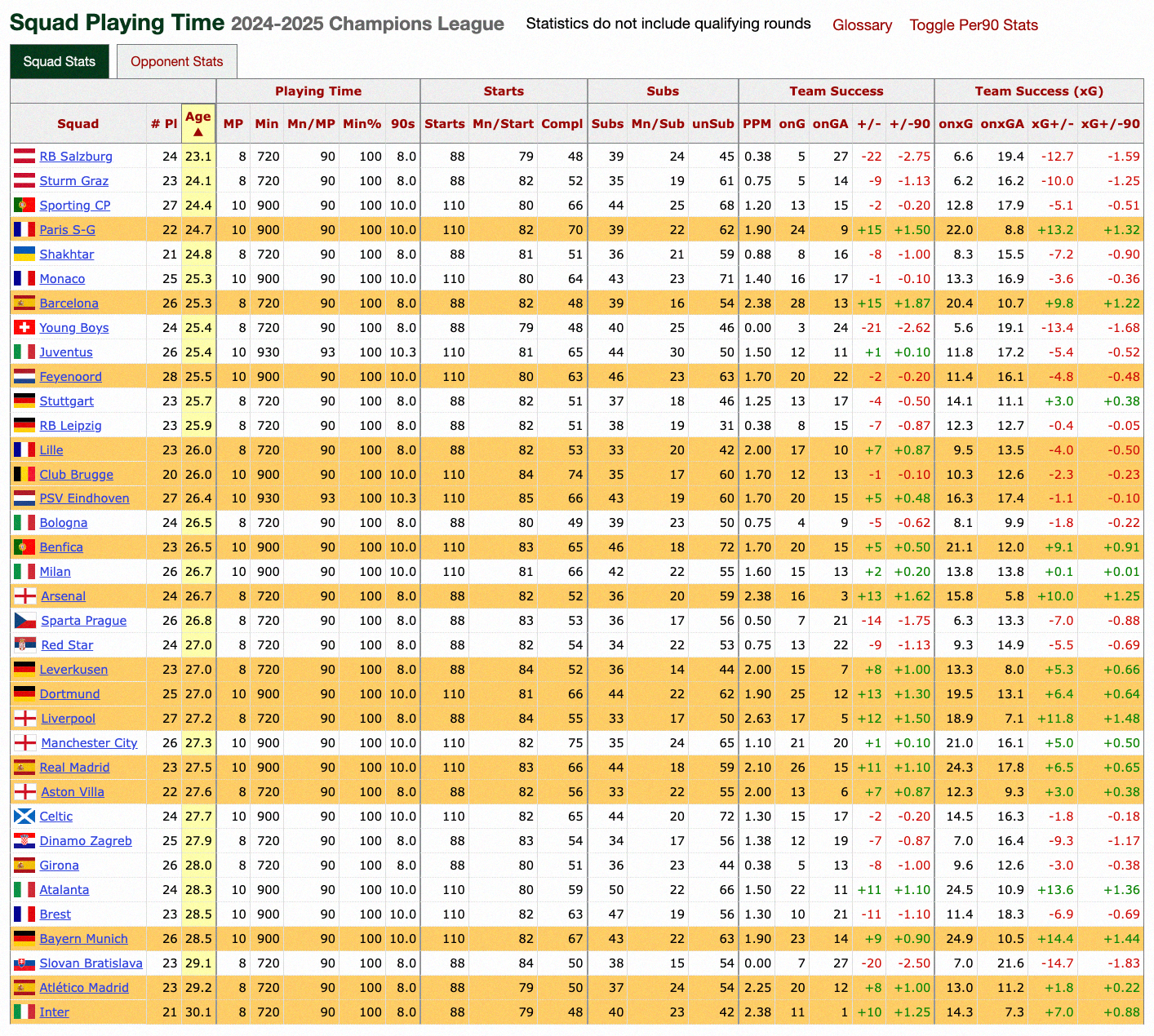 I'll start each section by highlighting the final 16 teams using the FBref Squad Playing Time page, which allows us to sort by weighted average age.