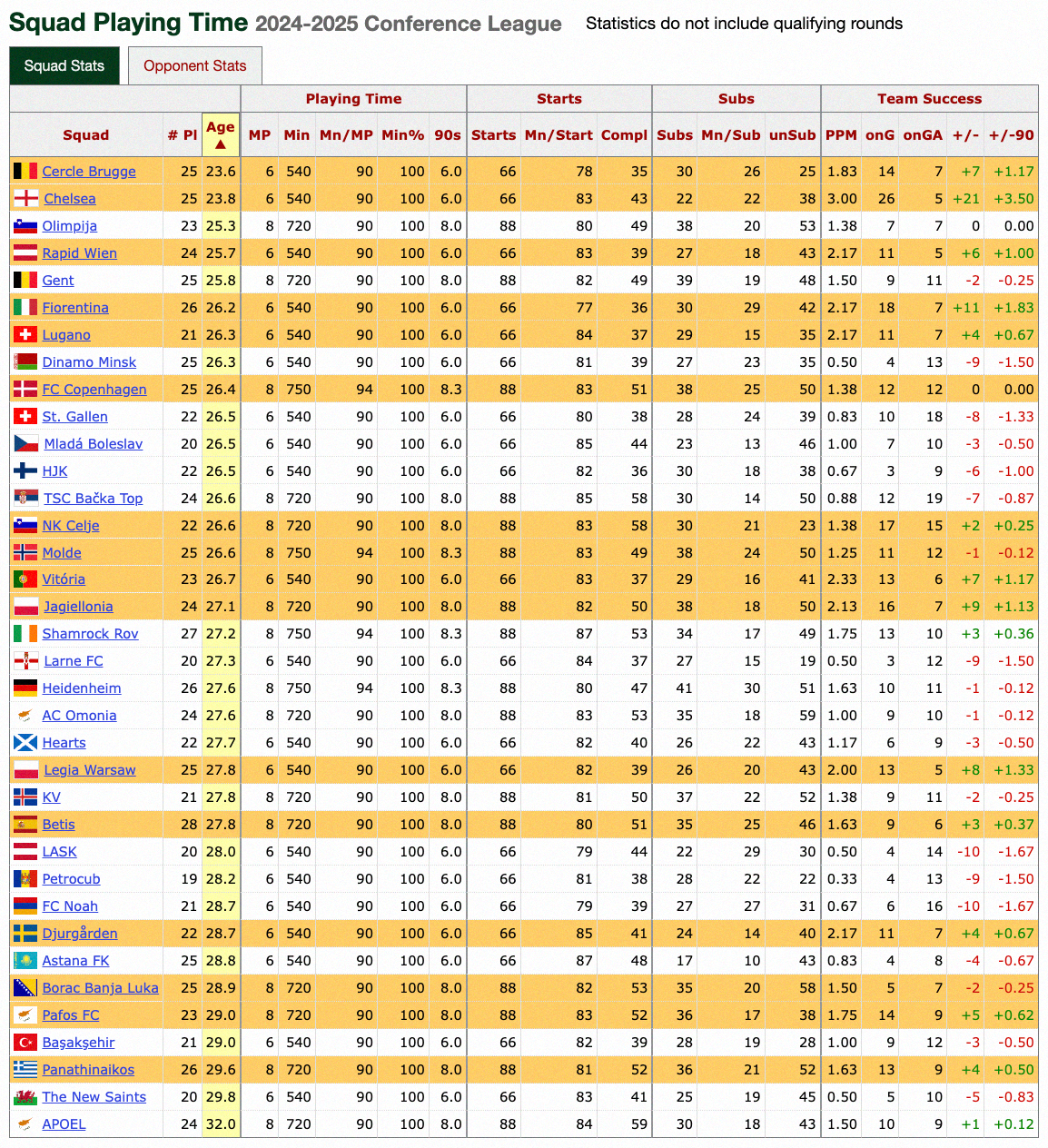Cercle Brugge and Chelsea are the only squads in the competition with an average age below 25 years old, let alone the Last 16. Fortunately, they kick-off at different times so you could sit down to watch both if the UECL is your go-to choice for Thursday nights.