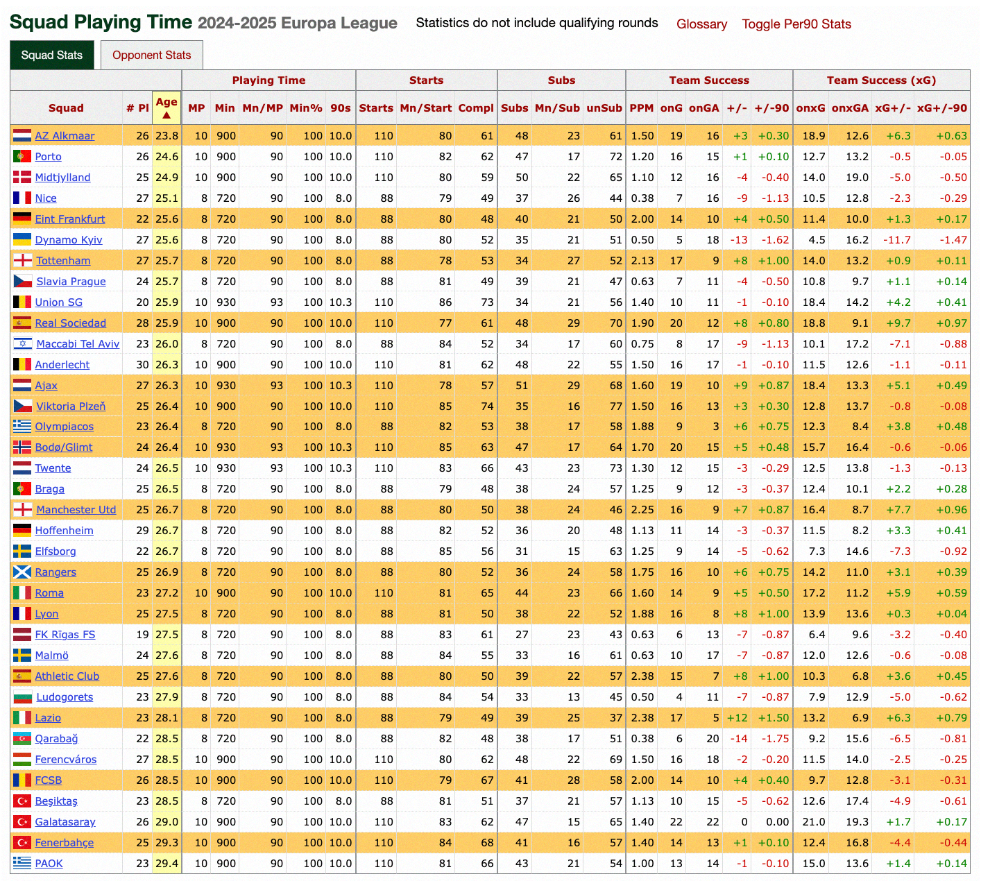 AZ Alkmaar are the SCOUTED-certified pick. Perhaps unsurprising given they have the youngest weighted average age in the 2024/25 UEFA Europa League, 18 players born in 2001 or later have made at least one appearance for the Eredivisie in this season's competition. That's an entire squad.