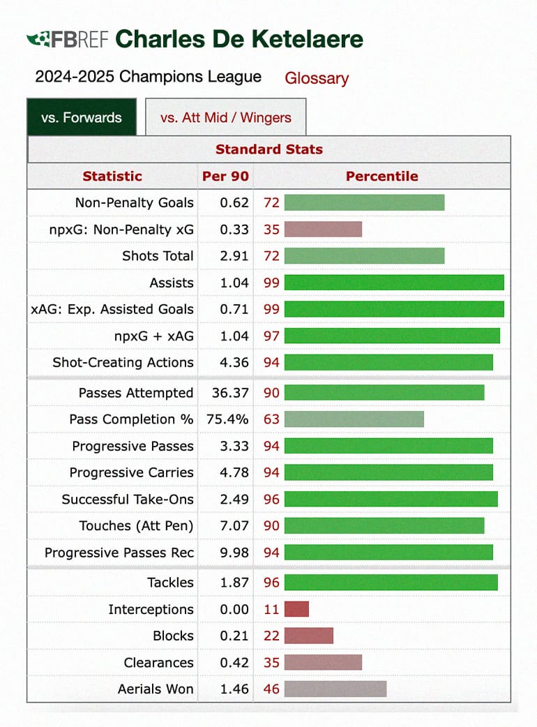In truth, I was left frustrated when searching for UCL options. I did not want to include another picks that may not play - Jhon Durán and Gonçalo Ramos both have interesting numbers - while the most interesting 01+ profiles were all wide forwards. Fortunately, Charles De Ketelaere (2001) just about counts.
