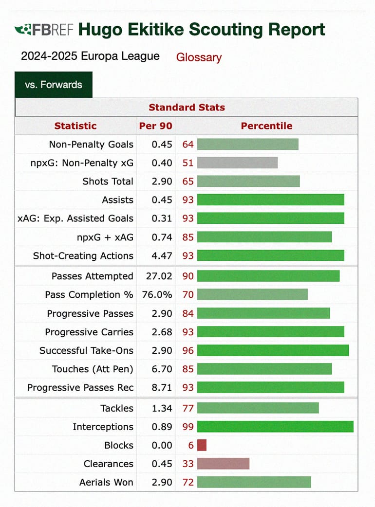 I made a passing comparison to Alexander Isak in the SCOUTED Stats section of last week’s newsletter. Watching Ekitiké again this weekend has only substantiated it. It’s hard to ignore the similarities between the slim, ectomorph body type, the silky touches and the ice-cool finishing. If Newcastle United are forced to sell Isak, Ekitiké must be the replacement. Of course, when the Magpies missed out in 2022, the striker stated “when PSG wants you and you’re French, you can’t refuse.” But even if Eddie Howe’s side secure UEFA Champions League football and keep Isak, they should register serious interest in the Frenchman.