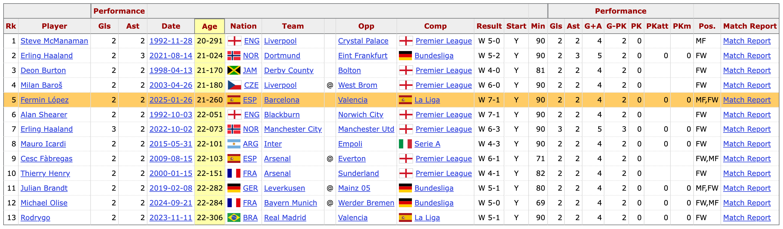 Only Fermín and Olise have scored multiple goals and provided multiple assists in a Big Five European League game this season. Only 12 different U23 players have done so on the Stathead database. Erling Haaland is the only one to do it twice.
