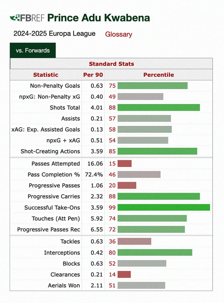 The only other player with 10+ successful take-ons and 10+ aerial duels won is Prince Adu Kwabena (2003). Despite the statistical similarity to Ekitiké, they have contrasting physical profiles. The Ghanaian is a pocket rocket powerhouse. This compact frame enables explosive bursts and ankle-breaking changes of direction across the frontline.