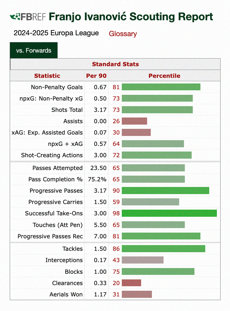 He dovetails nicely with Matěj Vydra. You can map their roles in your mind instantly after looking at their heat maps from the 2-0 win against Anderlecht. In that game, Vydra provided two assists, including one for his strike partner. Their dynamic was also encapsulated in the first goal of the night: Prince took control of a launch forward by strong-arming one defender before protecting the ball against another; after securing possession, he drifted into the penalty area before passing to Vydra who teed up a supporting midfielder. His hold-up play, even when facing a 1v2, is a staple of his game from what I have seen. Throw in the 3.6 successful take-ons per 90 (95th percentile in our group) and my excitement should not come as a surprise.