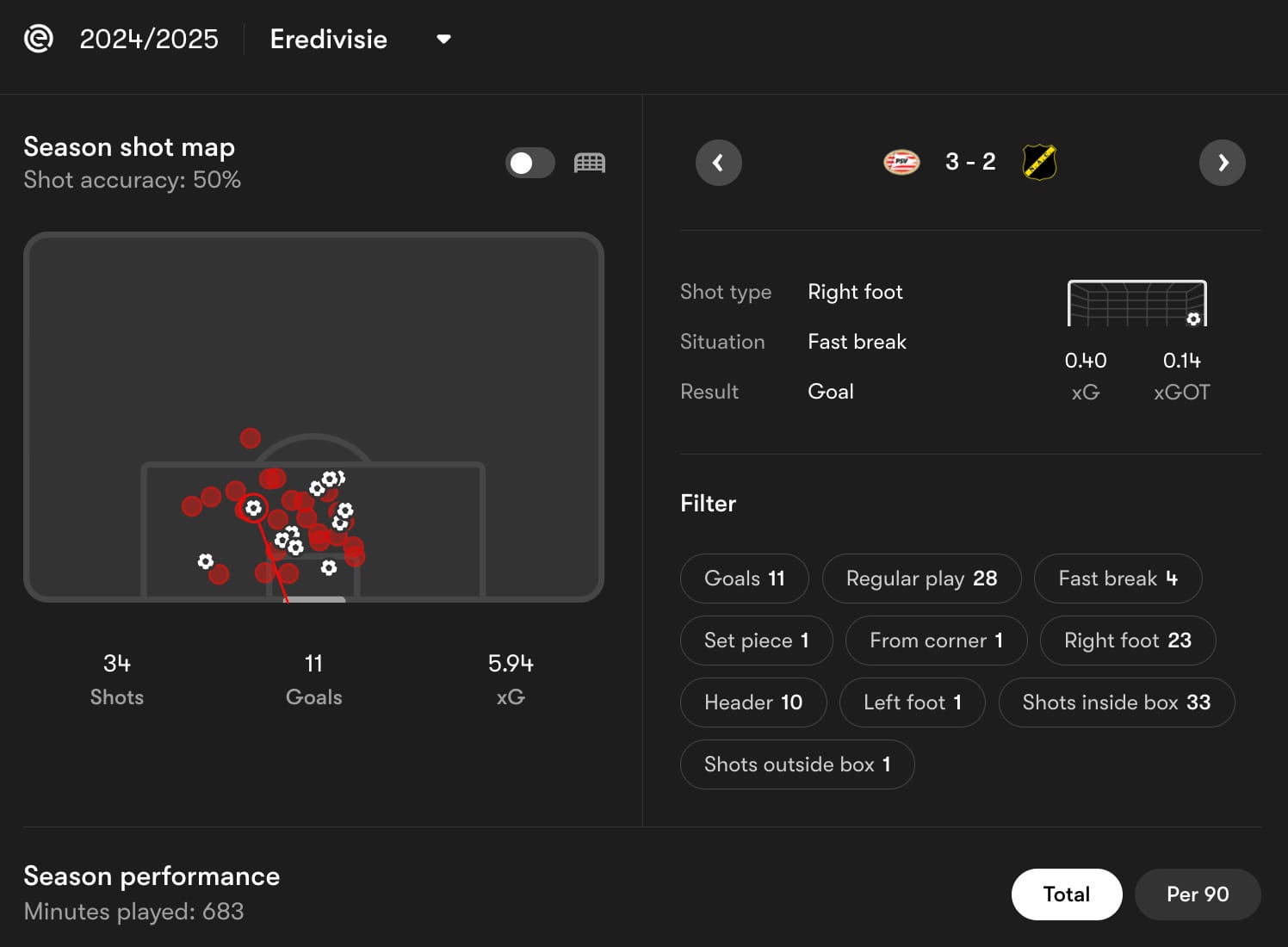 Despite averaging 2.6 shots per 90, he has only scored one goal. Despite averaging 0.57 npxG per shot, he has only scored one goal. Despite taking 23.7% of his total touches inside the opposition box, he has only scored one goal. And he only has one in the Eredivisie as well.