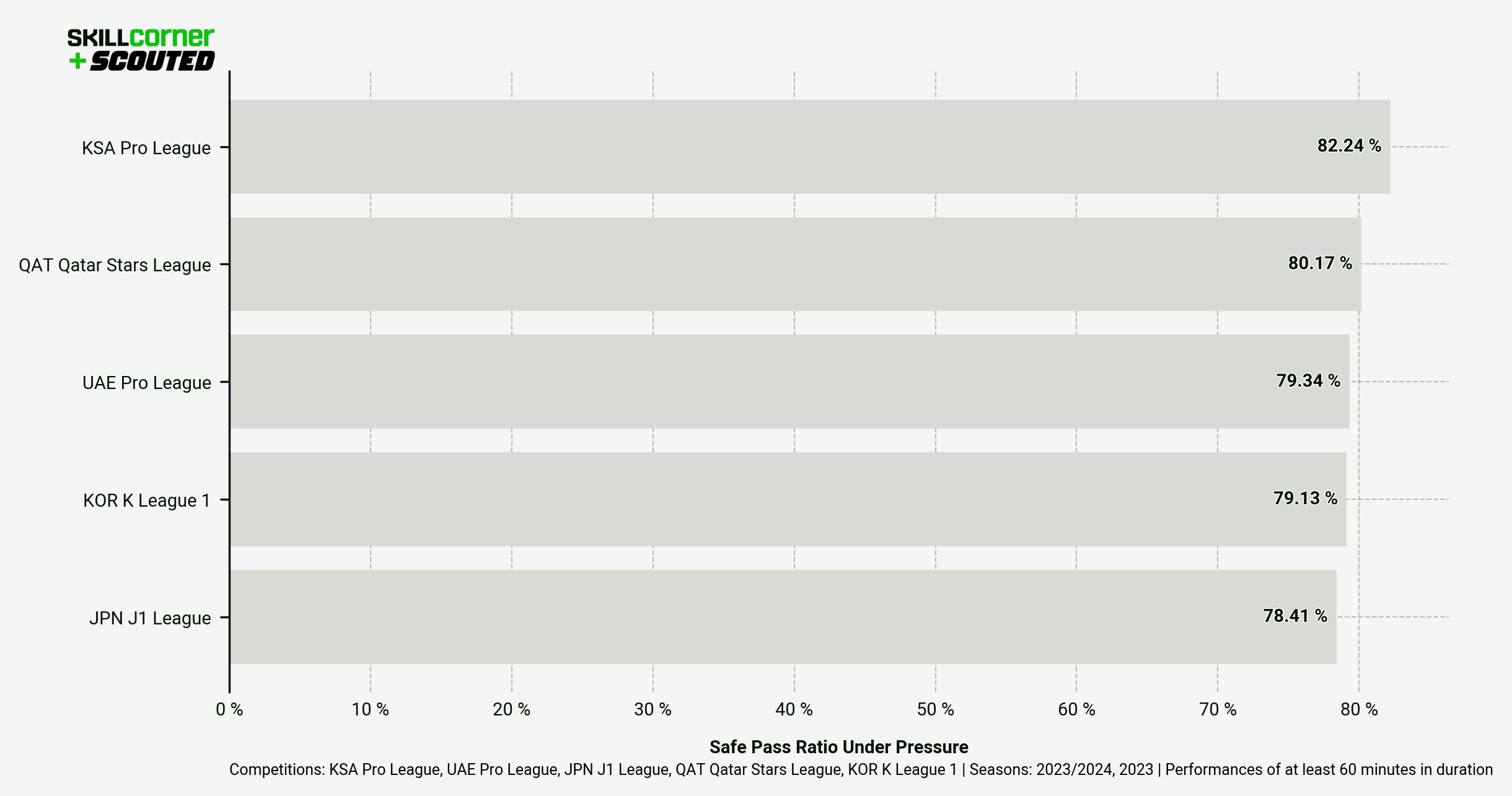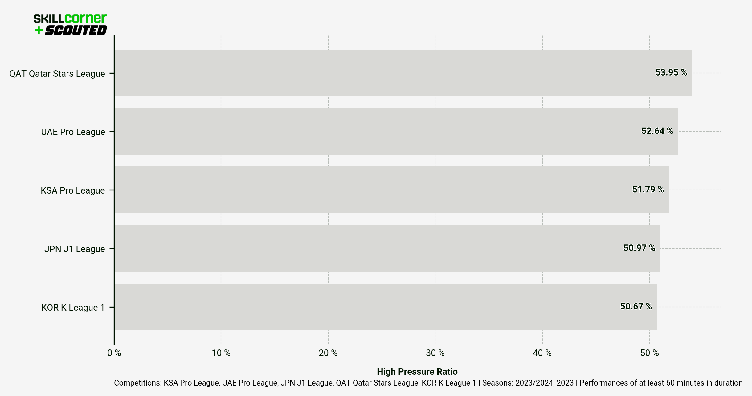 It’s interesting to note that Qatar — ranked second across most of SkillCorner’s physical metrics — is the second-lowest ranked league for ball retention ratio under pressure/high pressure.