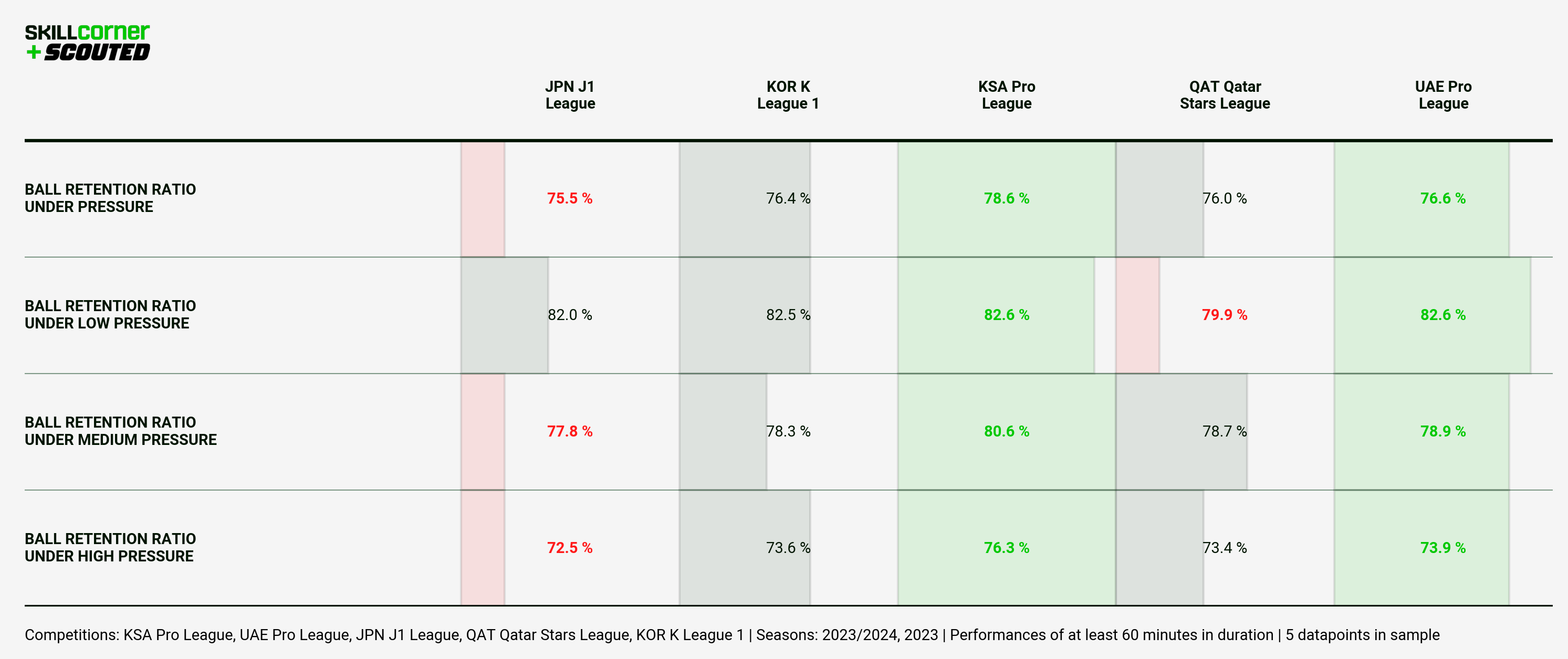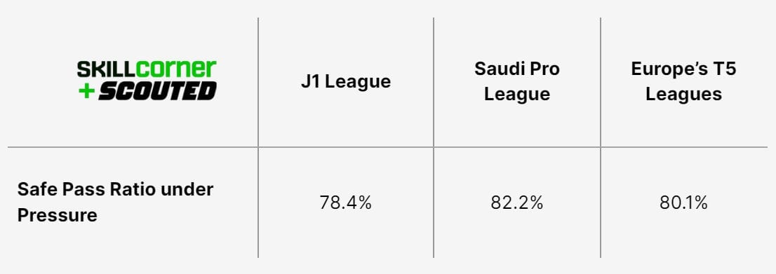 Interestingly though, the J1 League ranks lowest amongst our five chosen AFC leagues for ball retention ratio under pressure.