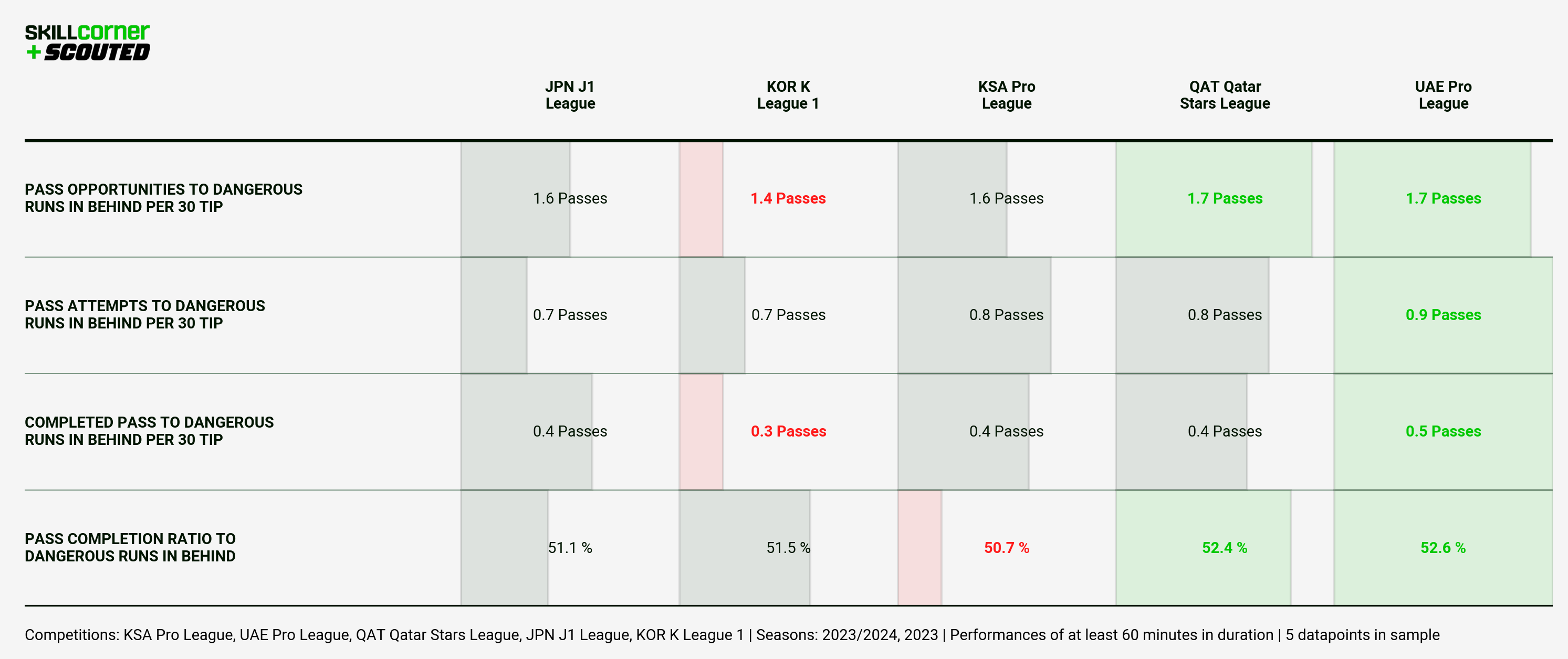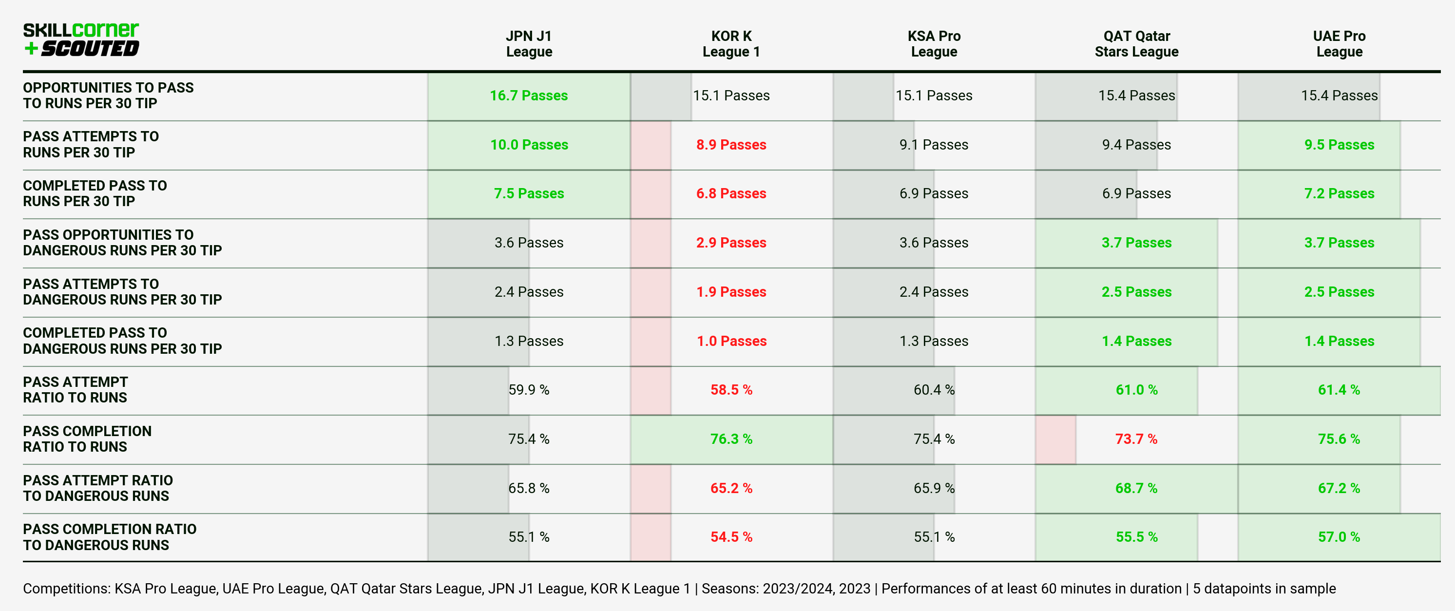 Again, I think a lot of this points to overall stylistic/defensive qualities of the leagues, with the UAE Pro League and Qatar Stars League being by far the two highest scoring leagues of our five, as we see them ranked one and two for completed passes to dangerous runs, pass completion ratio to dangerous runs, etc.