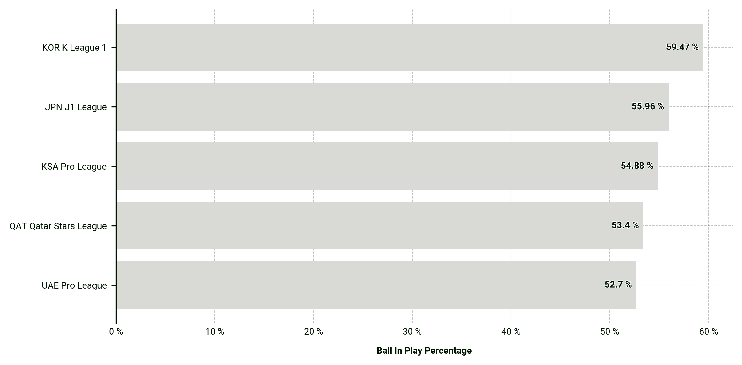 As you can see above, the K League 1’s ball in play percentage is miles ahead of the other leagues, which means there is less time for players to recover between sequences of play.