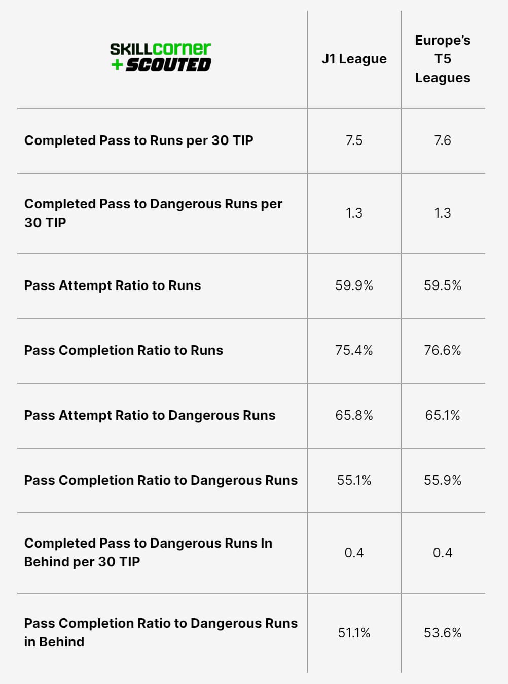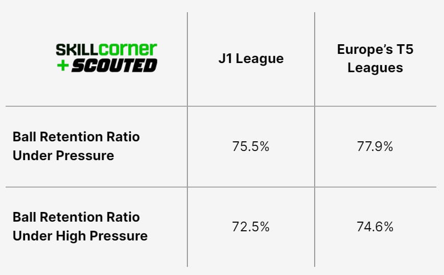 While maintaining a very similar athletic standard to the J1 League, Europe’s top five leagues are able to maintain higher ball retention numbers. Basically, as the speed and intensity ramps up, across the board players in Europe’s top-five leagues are still able to be more efficient than J1 League players.