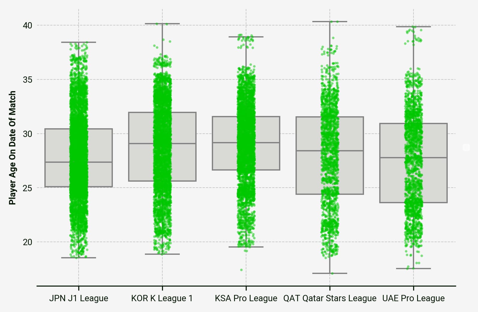 Lastly, let’s compare our five leagues by the age of their players: