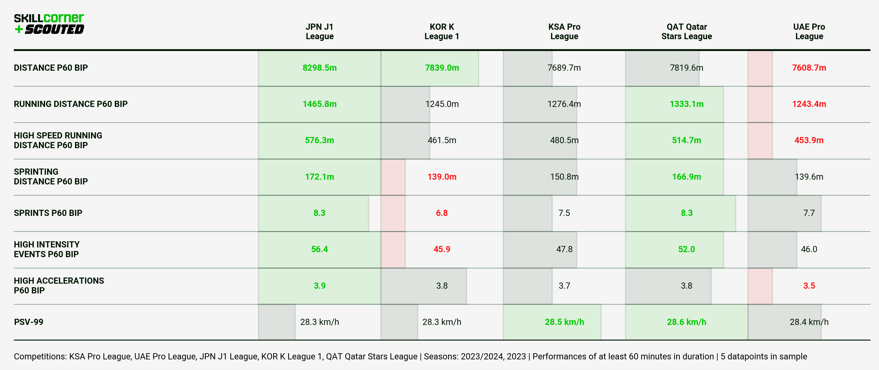 First up, let’s look at the spread of Physical data from the SkillCorner package, which is revealing in terms of the athletic differences that separate these leagues.