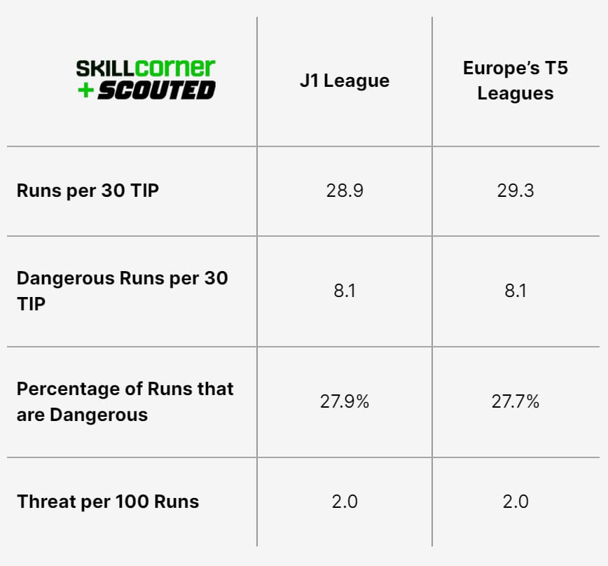 Note: these metrics are on a per-player basis. The average J.League player makes 28.9 runs per 30 TIP, compared to 24.3 in K League 1, etc.