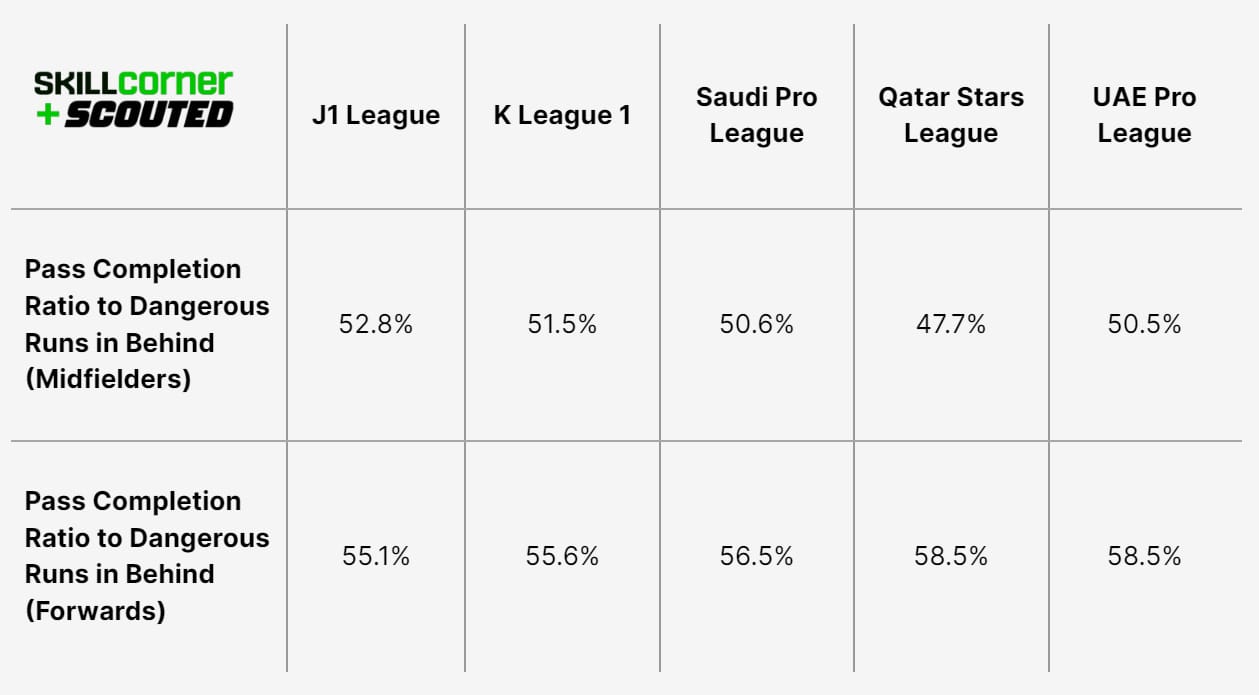 The more direct leagues in the Gulf are much more efficient when their forwards are making runs to dangerous passes in behind, while the opposite is true for midfielders. I would suggest this is more due to the structure of slow build-up play and counter-attacking in how it facilitates chance creation more than anything else.