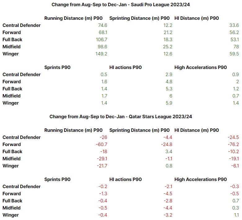 Here are some running data comparisons between the Qatar Stars League and the Saudi Pro League in the warmest months of the season in August-September (when the QSL played in air conditioned World Cup stadiums for the first five matchdays), and the coolest months of December-January.