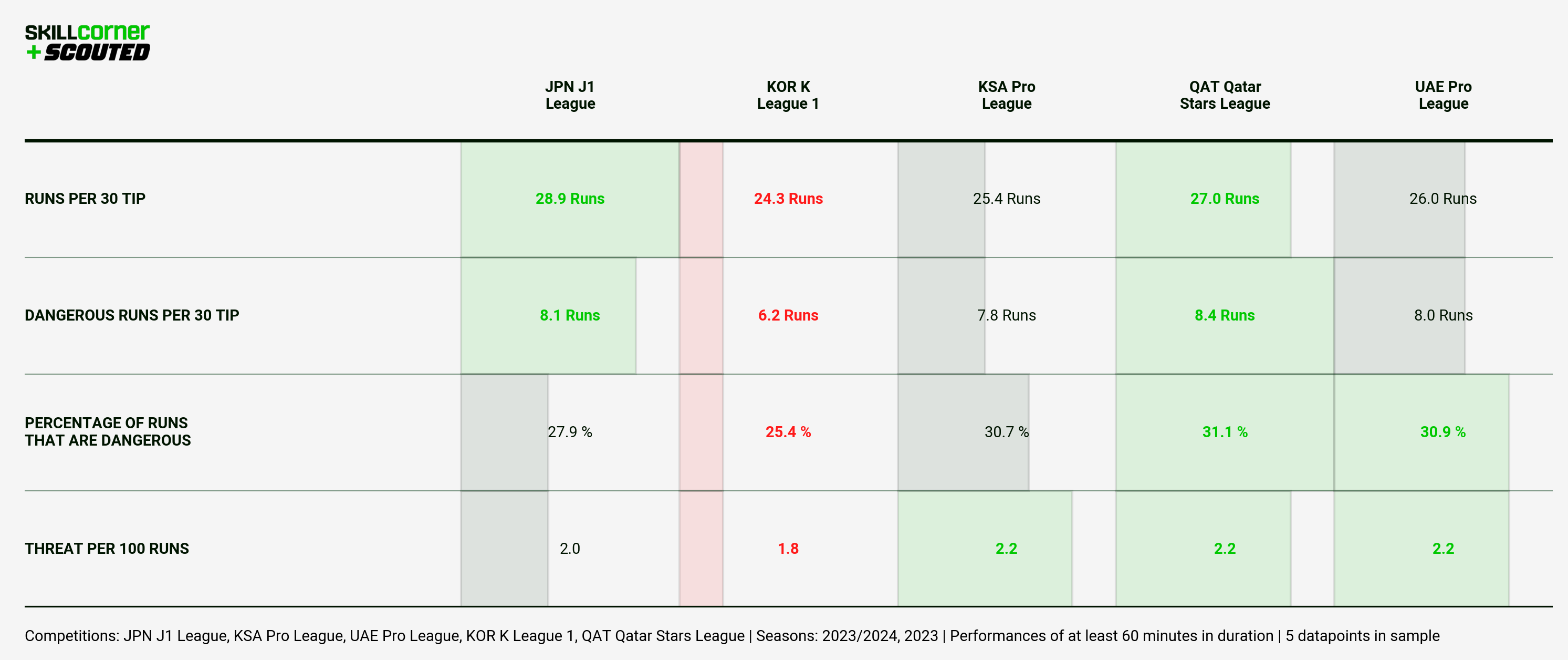 By contrast, the other leagues are quite balanced. The J1 League is the most active in terms of runs, but slightly less direct as reflected in less dangerous runs, while the three Gulf leagues swing the opposite way, with less runs overall but a much higher proportion of runs that are dangerous.