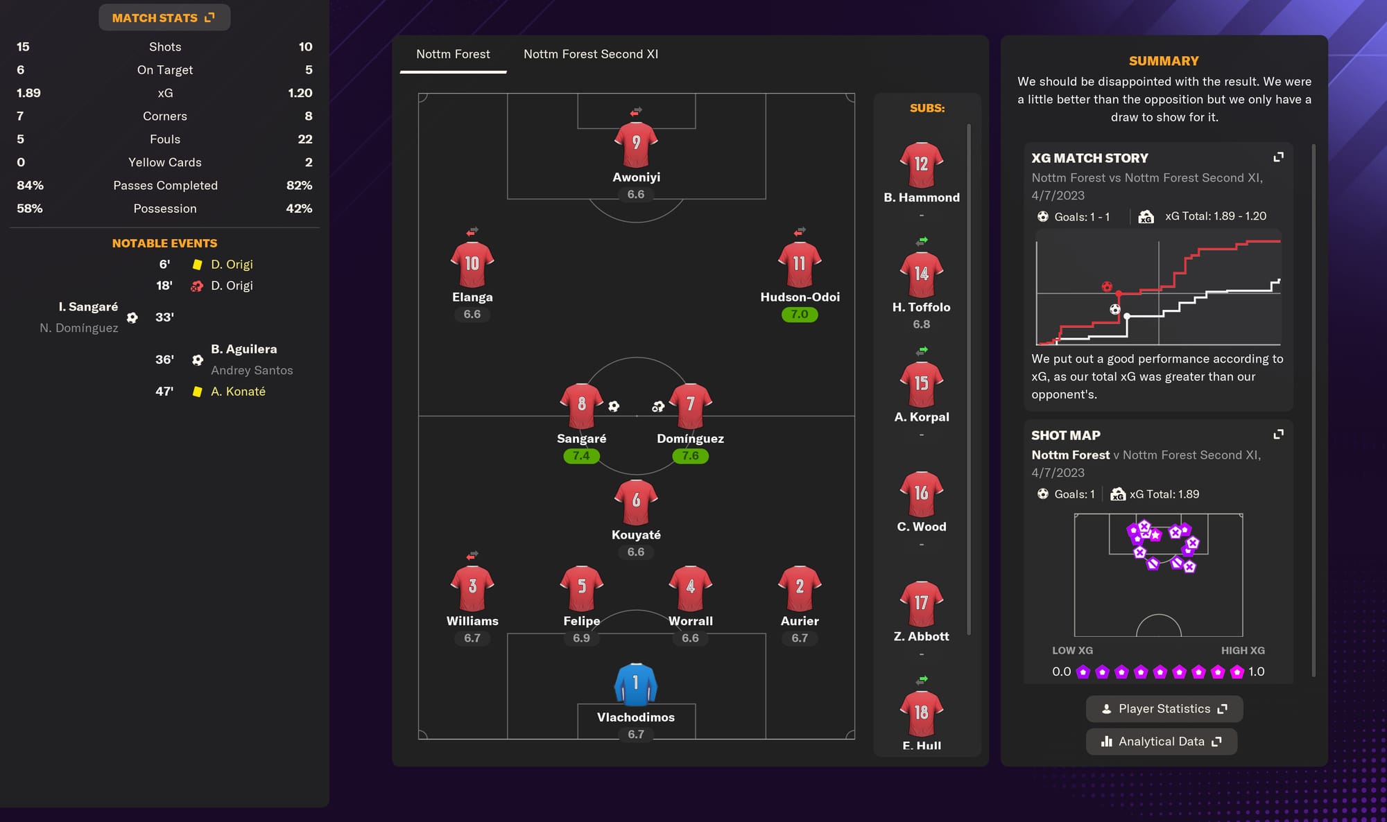 Seething, I set up the customary intra-squad friendly to get a first look at my team in action. It’s a draw, but my first team win on xG, which Twitter tells me is worth just as much.