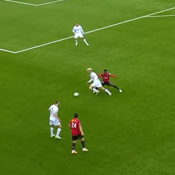 I really want to emphasise his scanning, too. It’s an oft overlooked fundamental which Bergvall has down to a tee. He does it all the time, snapping his head sideways twice a second, and it informs his positioning on the pitch and next decision in possession. He can execute these line-breaking passes before the gaps tighten up because he’s seen them before he’s received the ball.