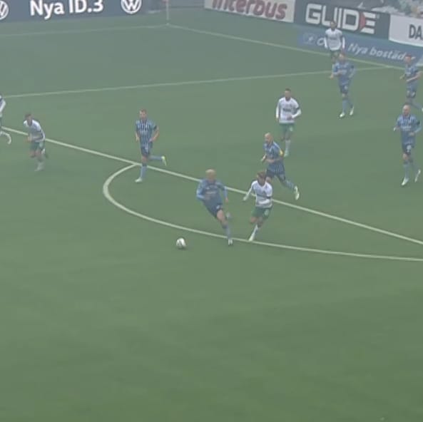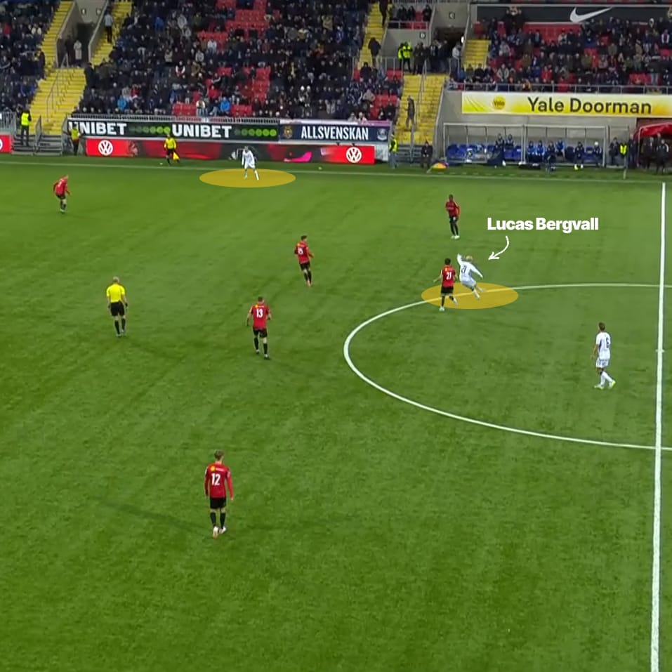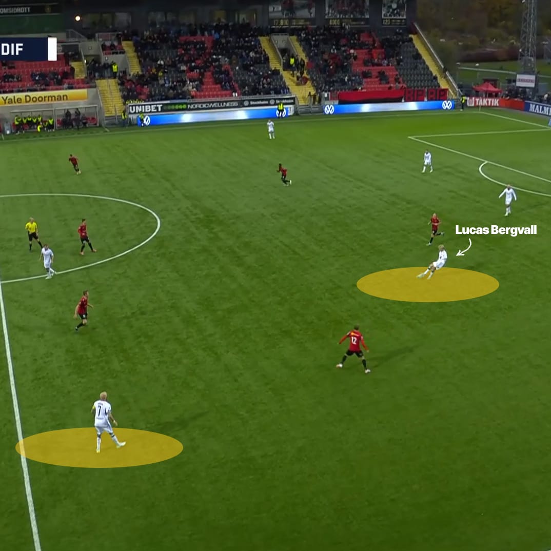 Bergvall’s typical role was that of a typical interior in a typical 4-3-3 shape. He predominantly operated on the right side of DIF’s midfield three, suiting his stronger right foot and picking up different spaces in different phases.