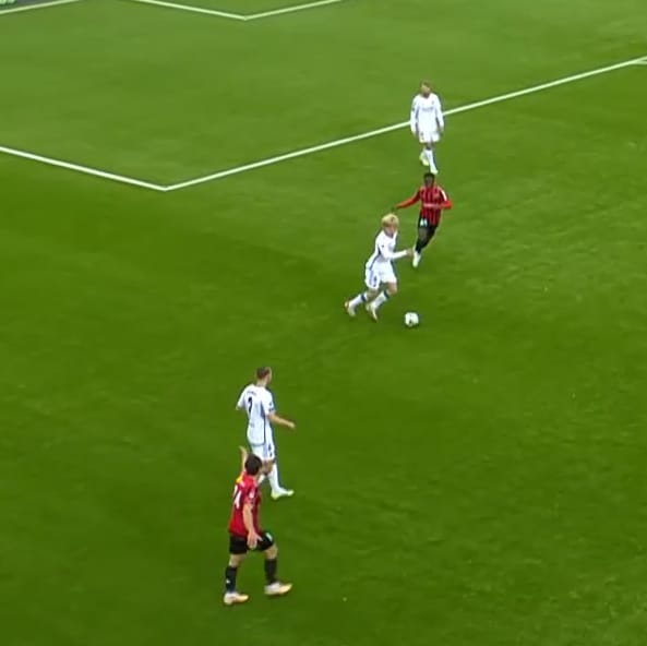 Beyond the more routine and regular, Bergvall showed flashes of real brilliance when escaping tight spaces in 2023 too. He loves a backfoot touch to take a defender out of the game in one simple step, and he doesn’t mind a humiliating little ball roll or dragback to kill an opponent on the spot.