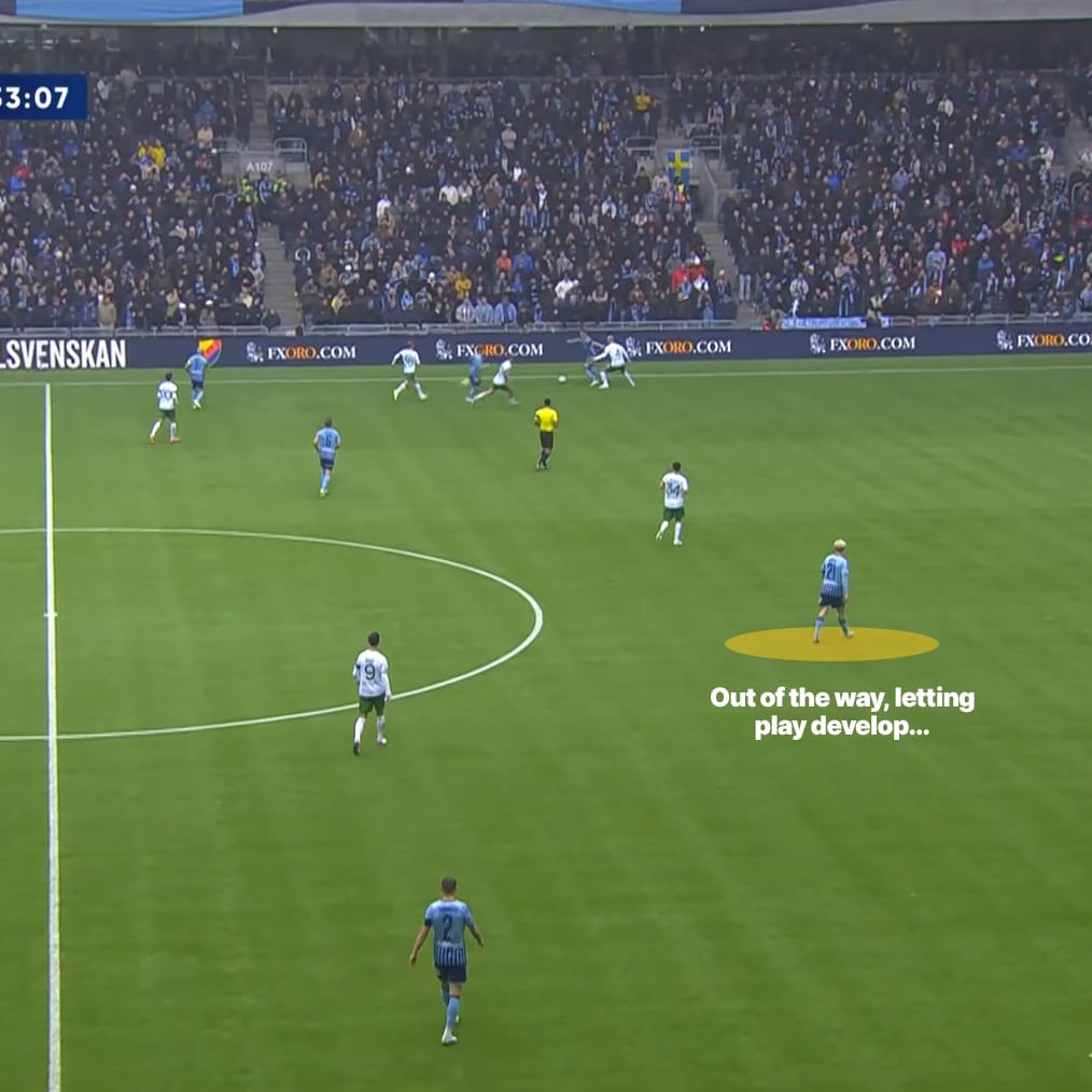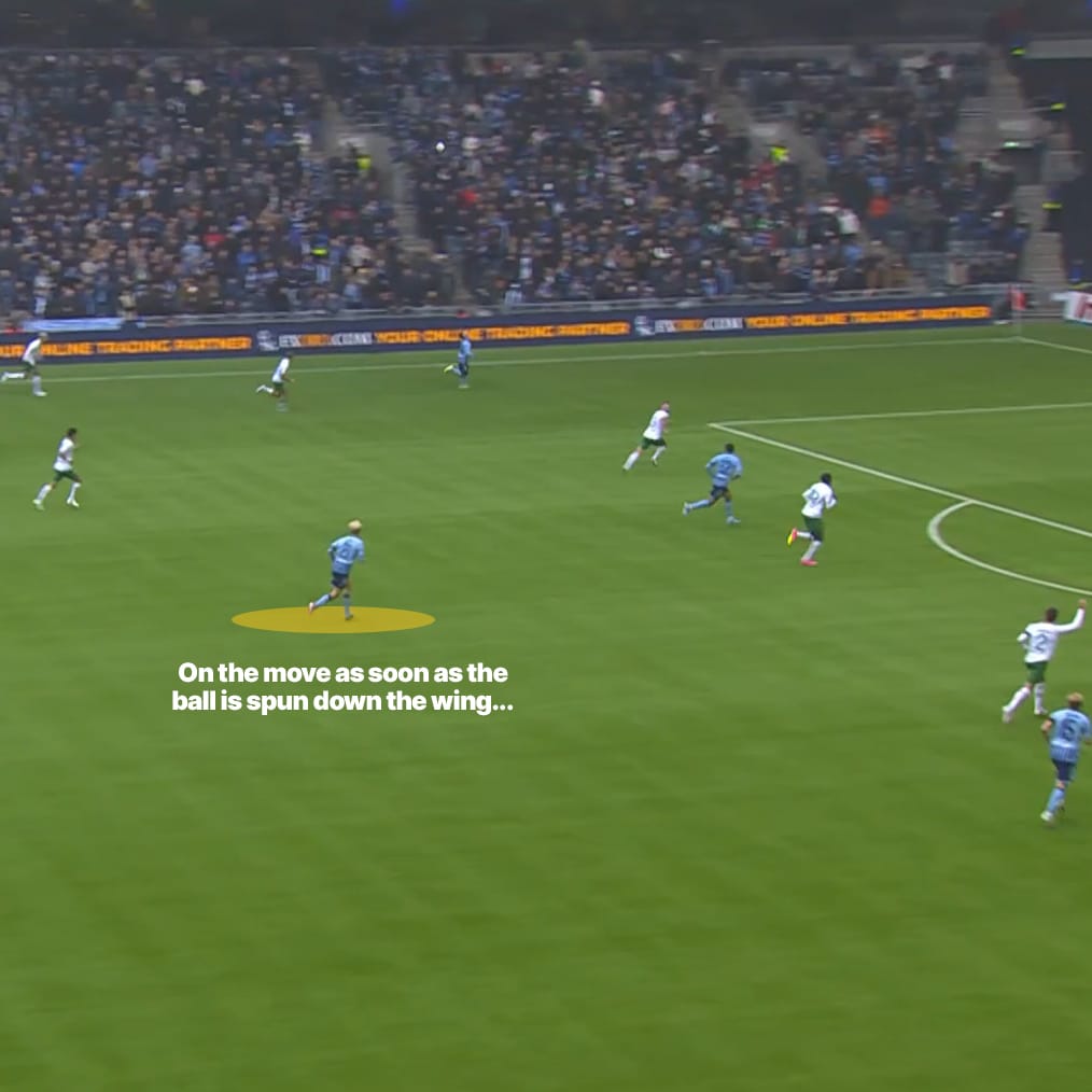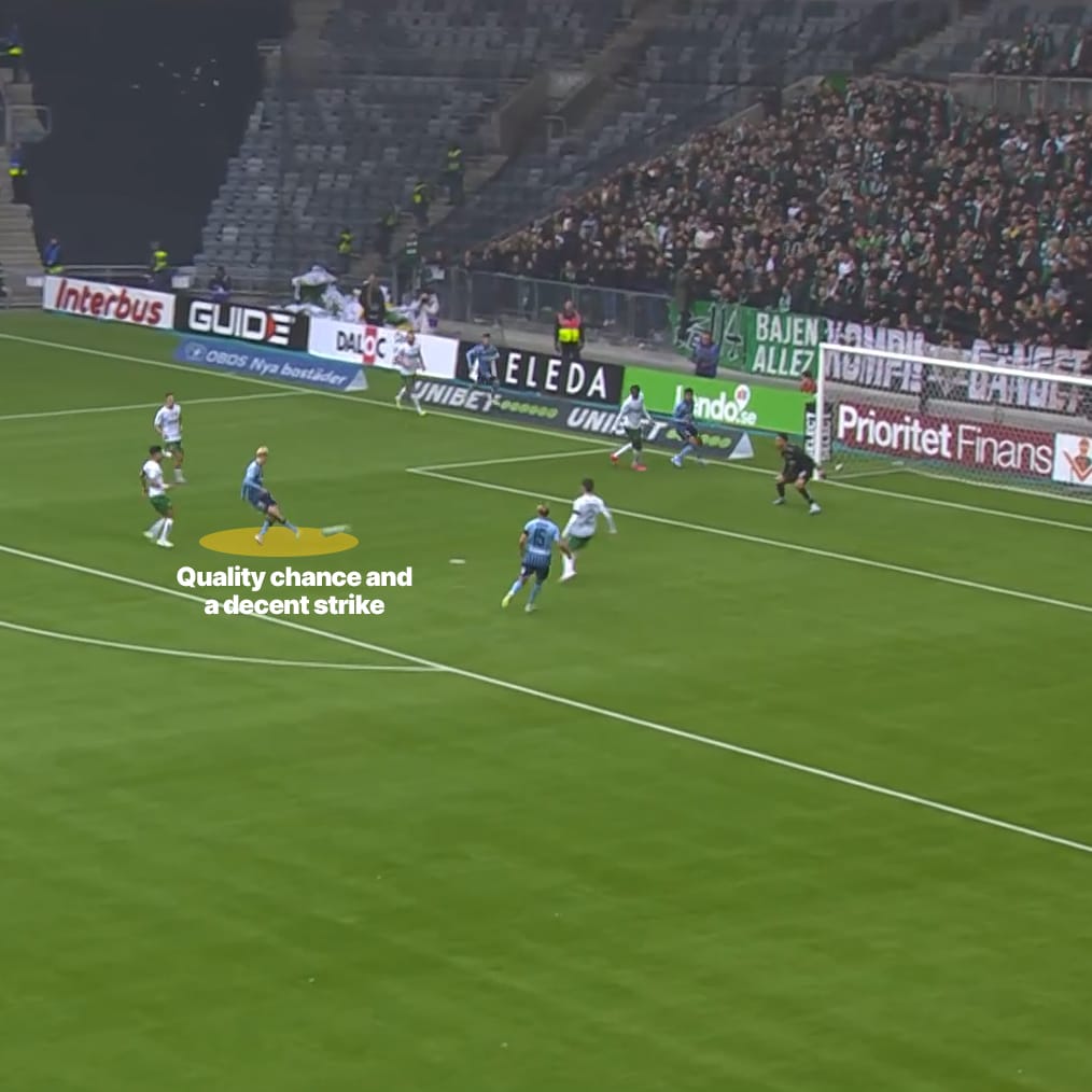 The screenshots above are an example of what I mean - there he is against Hammarby, floating in to get a good shot off a pullback. His shot choice (a first-time side-footer) was the correct one, it just lacked precision. His patience to let the play develop means he drifts into that space with nobody near him, and that’s the consistent feature of his shot-getting threat.