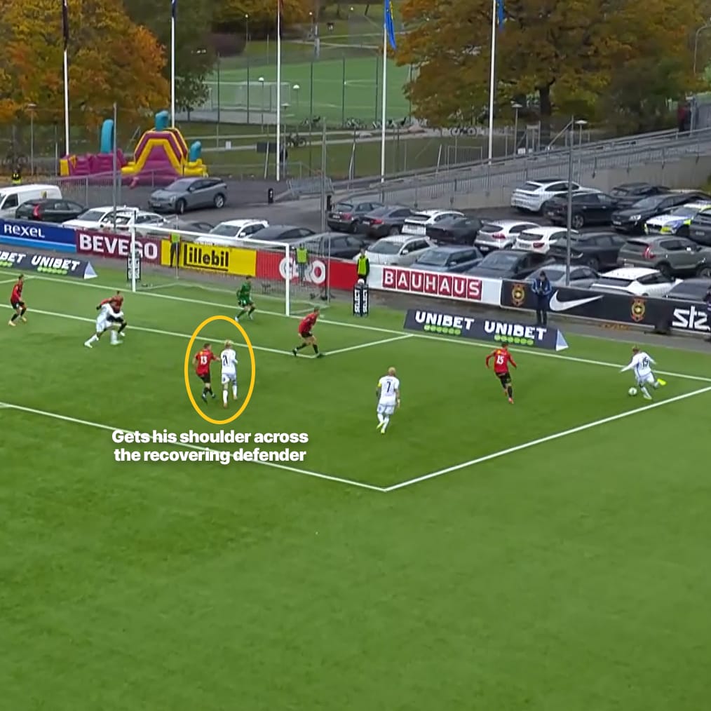 He has plenty of room to grow, that’s obvious and undeniable, but the base attributes of his athleticism promise plenty: he’s listed as 1.87 metres (or 6’1”) and often looks like one of the tallest on the pitch in any given Allsvenskan game. That’s a frame which lends itself well to the increasingly-demanding physicality of the best of the best, especially once he fills out into it.