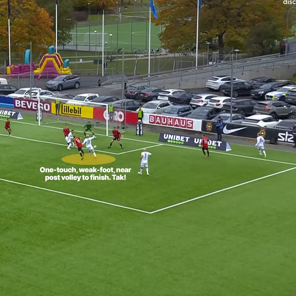 That one against Hammarby is the prime example - Bergvall swivels on the spot to whip a wicked cross into the ‘corridor of uncertainty’, causing all sorts of goings on at the back post - and there were a couple more in his limited season sample that achieved similar. He doesn’t take the set-pieces at DIF, but you can imagine his crossing technique lending itself well to those as well.