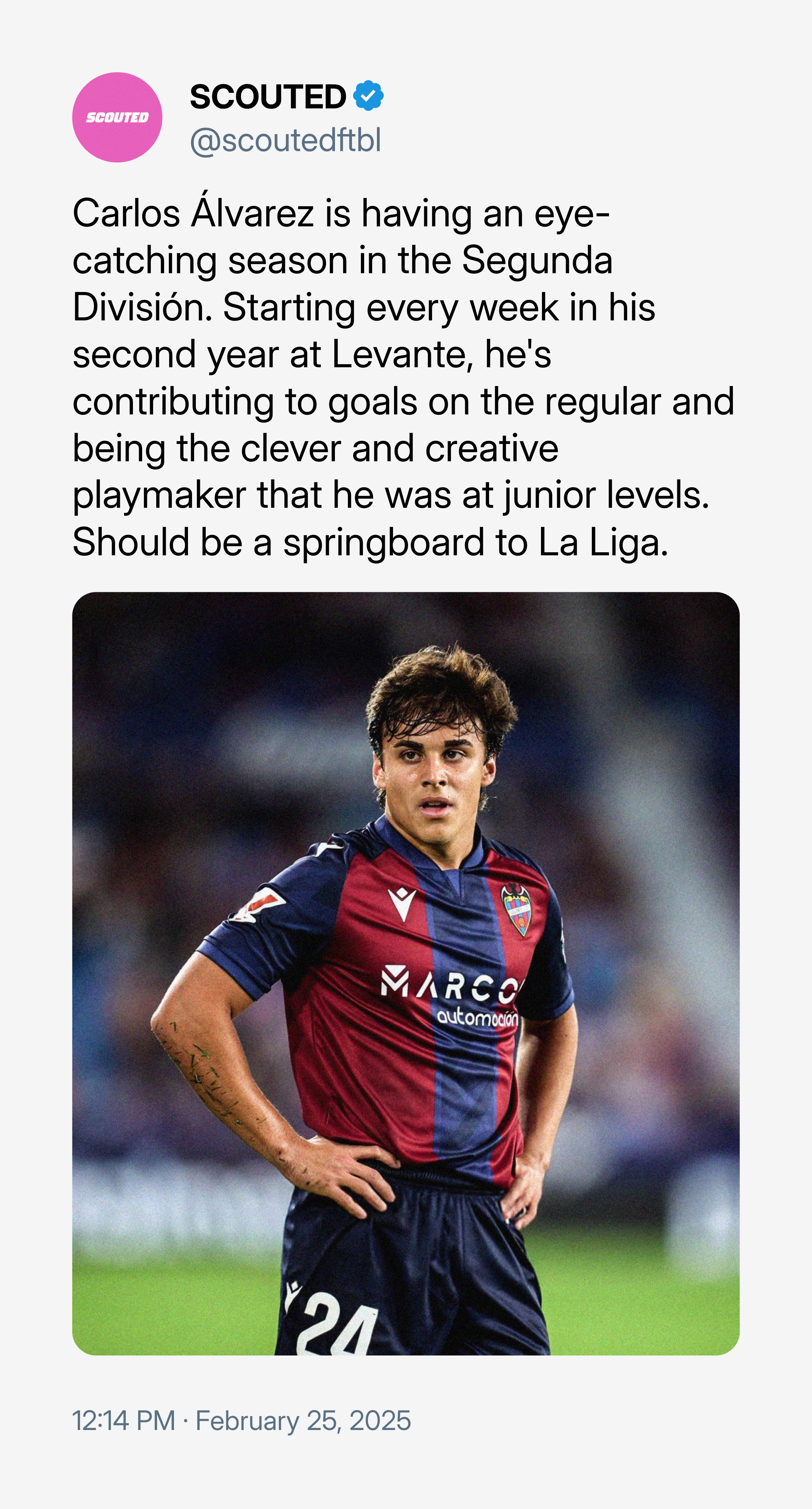 Since that screenshot, Álvarez has signed for Levante and became a first-team regular in his second season at the club. In 2024/25, the diminutive playmaker made 43 appearances for the eventual Segunda División champions, scoring seven goals and providing 11 assists. He also ranked third for Key Passes and Big Chances Created.