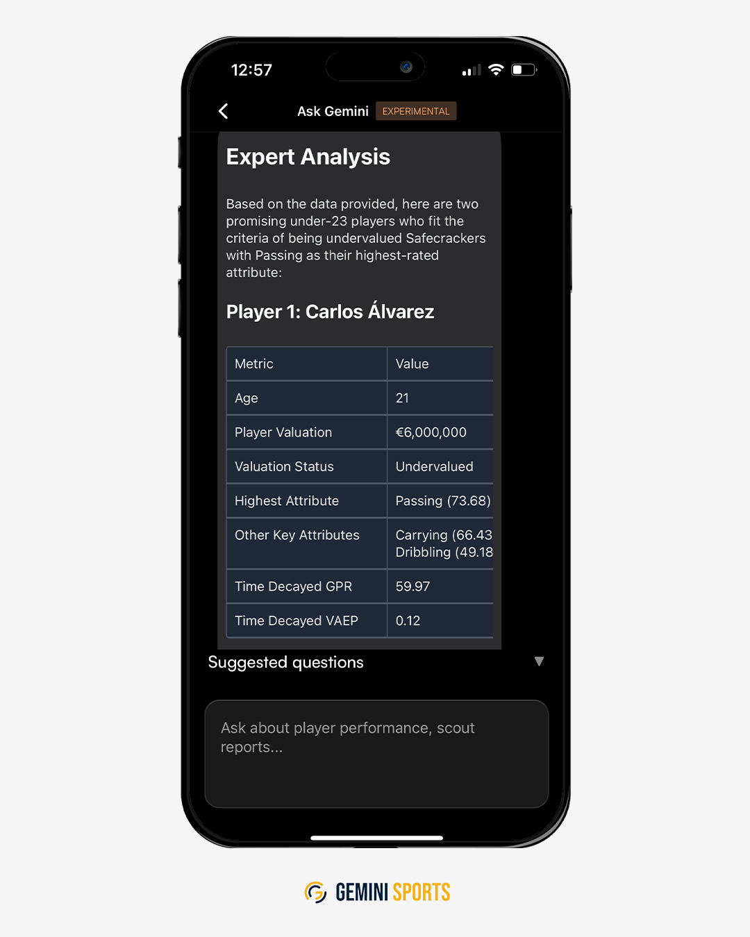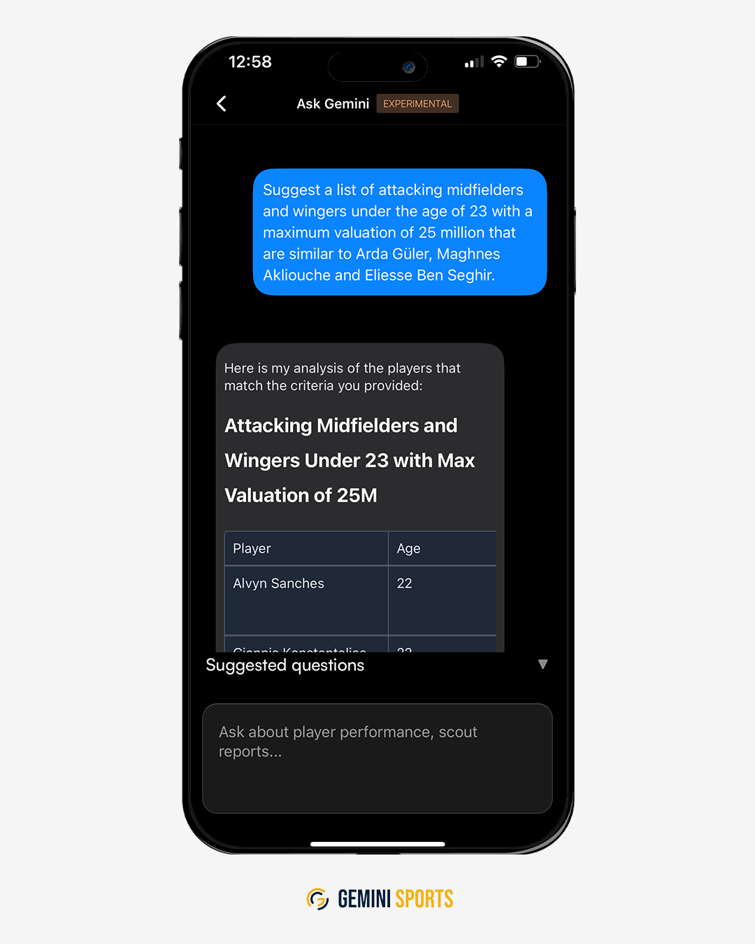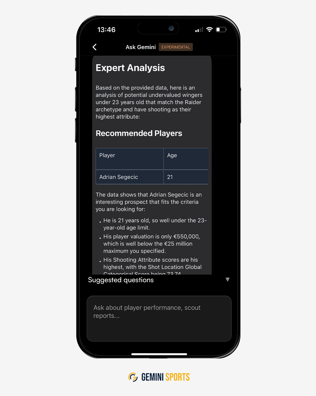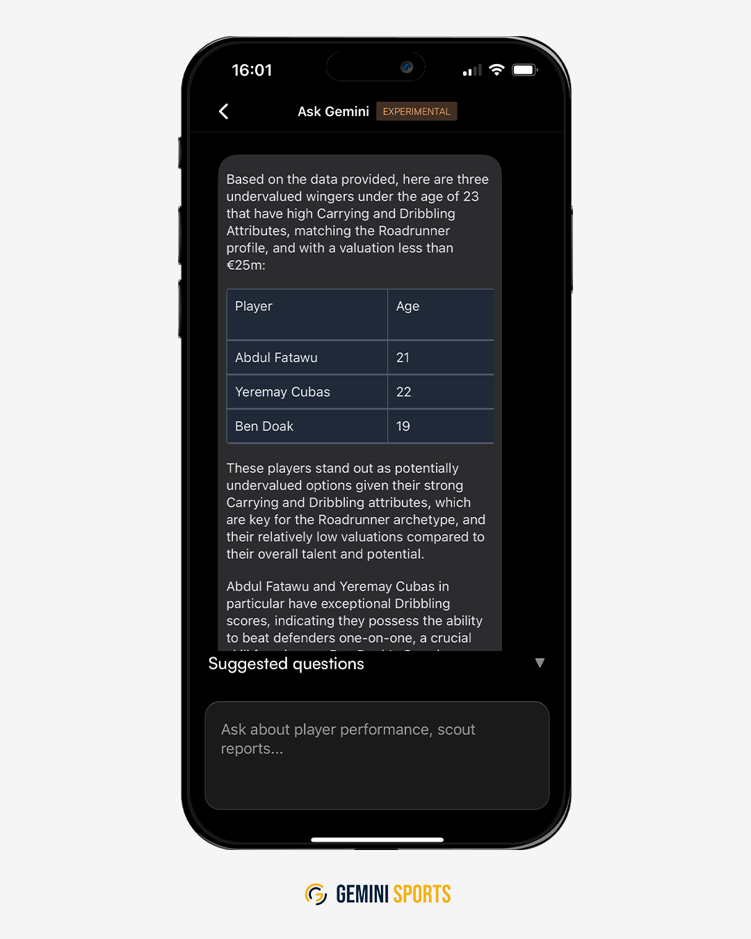 Using Archetypes to lead the AskGemini search shows the value of player profiling. The bulk of the work is done when constructing, interrogating and refining the Archetypes. Making each profile as robust as possible will in turn improve search results when using tools like the Gemini Sports app, enabling clubs to evaluate their own picks as well as discover players that might have slipped through the net.