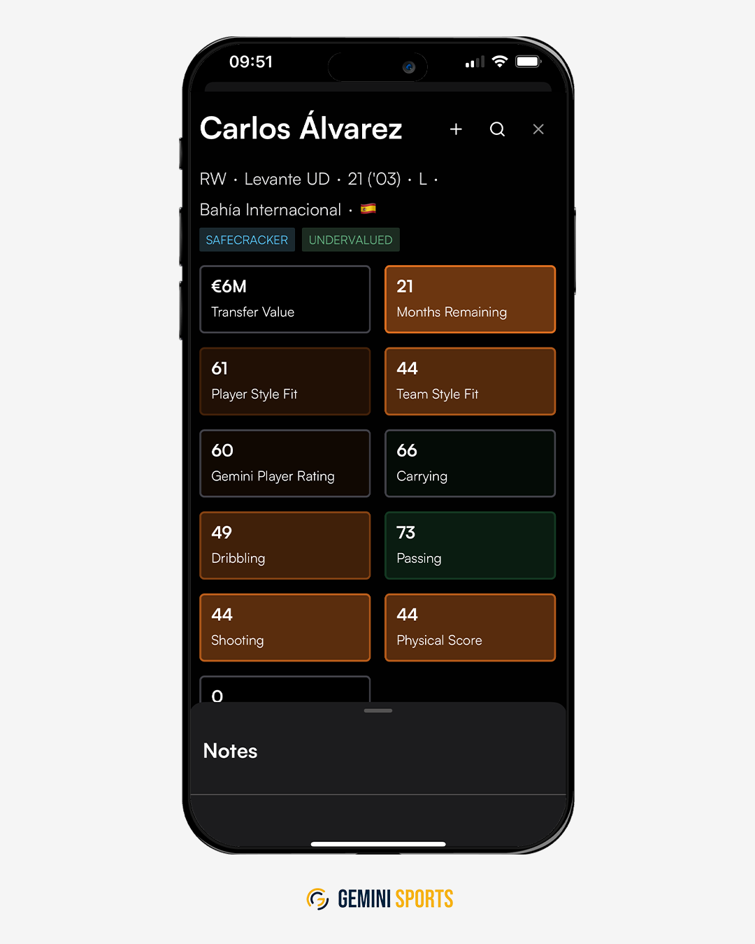 Carlos Álvarez is a 21-year-old Spanish winger currently playing for Levante UD in La Liga. His highest-rated attribute is Passing, with a Passing Positional Categorical Score of 73.68. He also scores well in Carrying (66.43) and Dribbling (49.18), suggesting he has the technical ability to be an effective Safecracker.