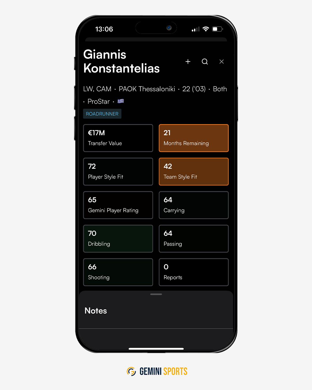 That leaves Giannis Konstantelias. He’s the player I really wanted to highlight, primarily because of his well-rounded profile. He scores at least 60 for the core Attributes while his 70 Dribbling tips him towards the Roadrunner Archetype. But I also wanted to spotlight Konstantelias as he is one of three exciting Greek players that could have featured.