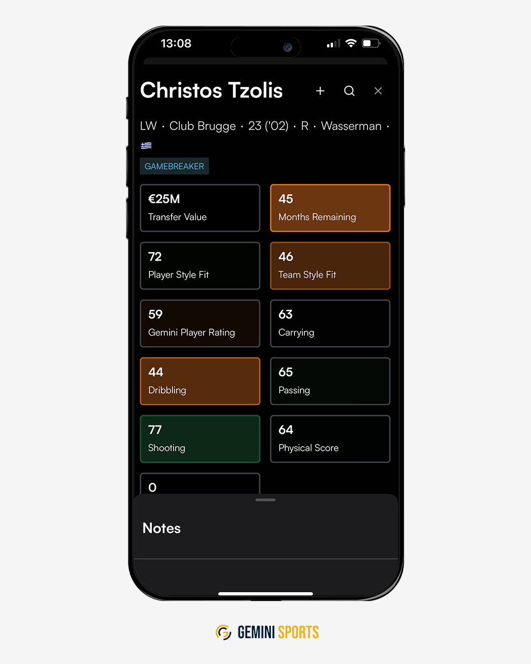 To build this shortlist, I have used the latest feature within the Gemini Sports app: Ask Gemini. I was able to query all of our available data, notes, Archetypes and Attribute scores, and more in plain-text and get answers in just a few seconds. Here is a reminder of the winger profiles: