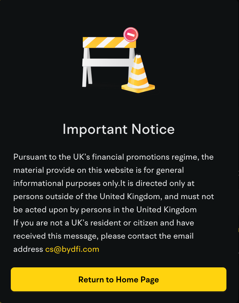 The problem is very few of these companies are registered with the Financial Conduct Authority (FCA) which regulates these markets in the UK. They’re all, of course, registered in tax havens abroad; BYDFi is incorporated in Seychelles and is not registered with the FCA. This means they are not permitted to undertake FCA-regulated activities - including promoting or marketing their services to UK-based consumers. If you try to sign up with BYDFi in the UK, you are blocked and shown this disclaimer: