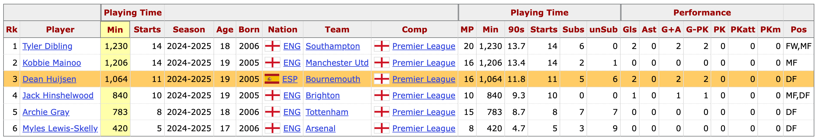First of all, it’s important to highlight that only six players born in 2005 or later have started at least five Premier League games this season: Myles Lewis-Skelly, Tyler Dibling, Archie Gray, Kobbie Mainoo, Jack Hinshelwood and Dean Huijsen.