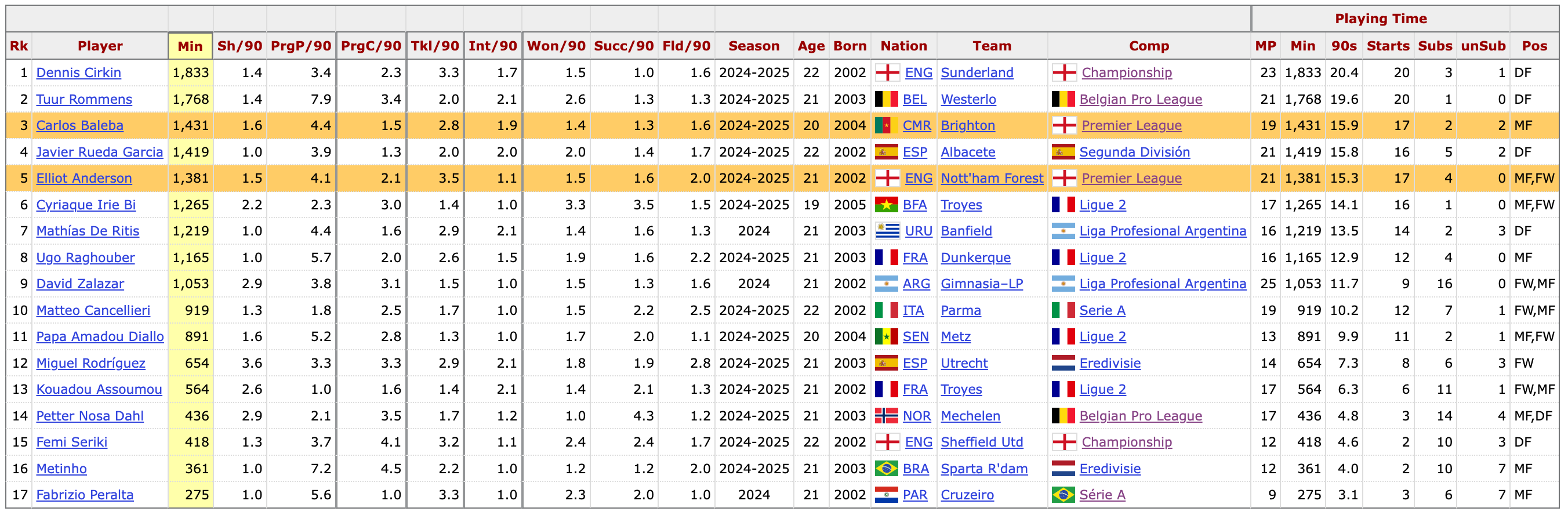 For the first search, I repeated the Baleba-Anderson query above, this time searching for players born in 2002 or later with 270+ minutes across the listed leagues in 2024 or 2024/25. Here are the results: