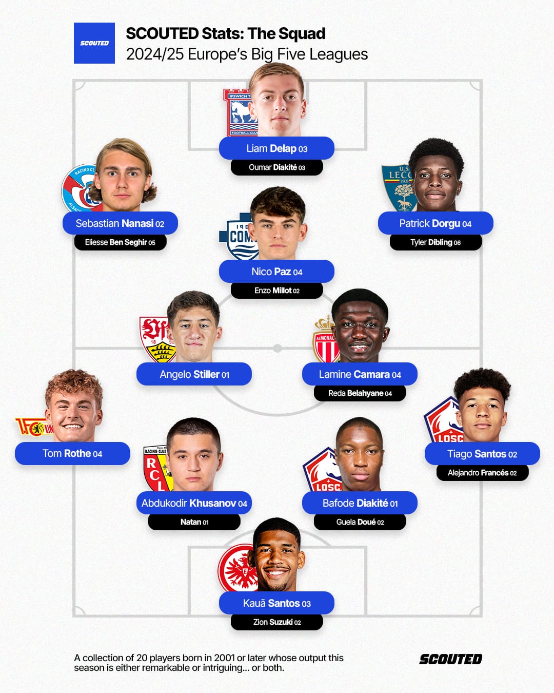 Before this weekend, 1,612 outfield players had played at least 360 minutes across Europe’s Big Five Leagues this season. 467 of them were born in the year 2001 or later. I have selected 20 fascinating profiles to share with you. This is the SCOUTED Squad.