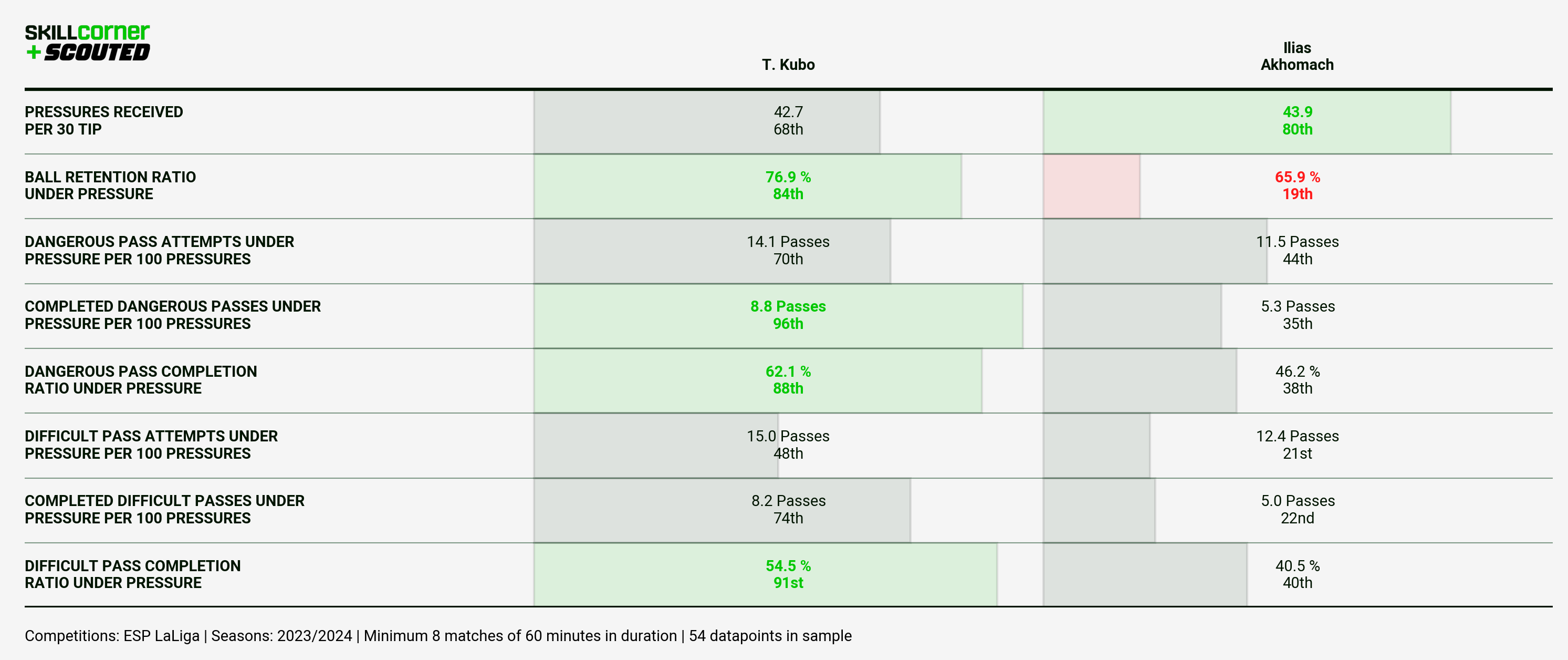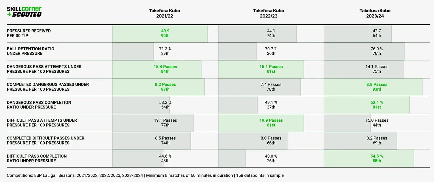 I absolutely love to see this kind of development. This is a player that has gone from being the complete go-to guy at Mallorca (49.9 pressures received per 30 TIP!!!) and somewhat having to force things, to wrapping his head around being a complimentary piece in a bigger puzzle. He has worked out how to slot himself in efficiently, with his Dangerous and Difficult Pass Completion ratios shooting way up, while his Difficult Pass Attempts per 100 Pressures came down massively in 2023/24. While on one hand, Kubo is an incredible technical talent that has always been capable of this, it’s also a credit to the club and coach-led development plan at Real Sociedad that has been able to extract it out of him.