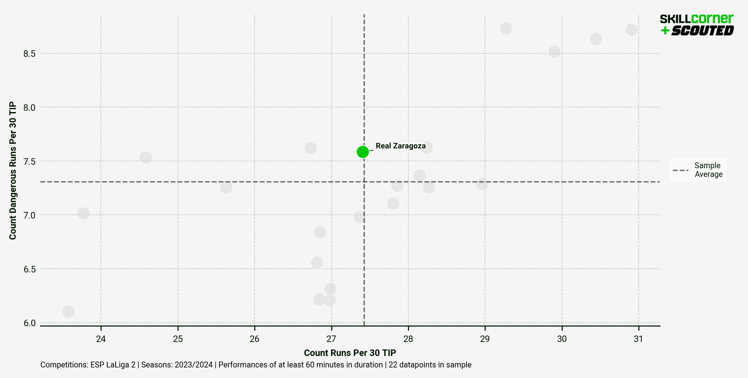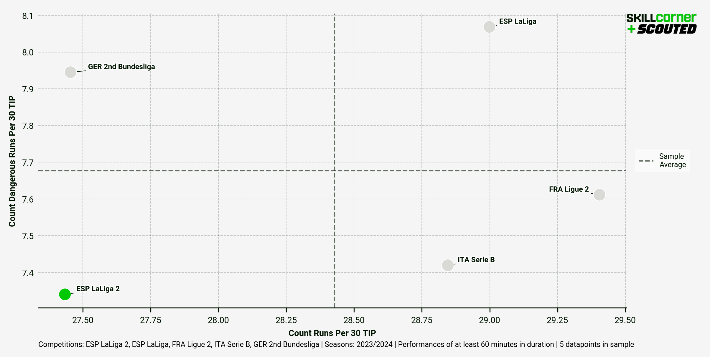 A club that plays a fast, transitional style should be able to make things work with Azón. The issue is not many teams in his division do. In terms of runs and dangerous runs made, Segunda ranks lower than La Liga and even equivalent second divisions, such as Serie B and Ligue 2.
