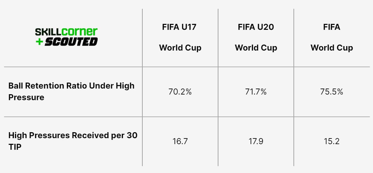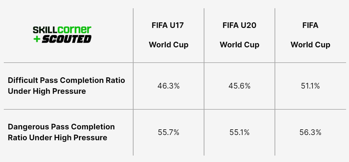 Here, you can see where the senior players again elevate themselves over the juniors. The U-17s and U-20s are executing difficult passes under high pressure 46.3% and 45.6% of the time, while the seniors are up at 51.1%.
