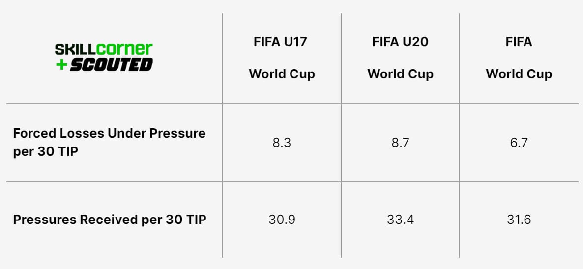 I was a tad surprised to see that total pressures received per 30TIP were pretty level between the U-17 and men’s World Cups, with a little blip in-between at the U-20 World Cup.