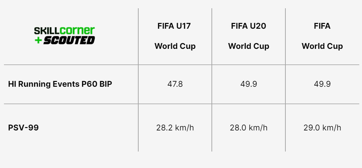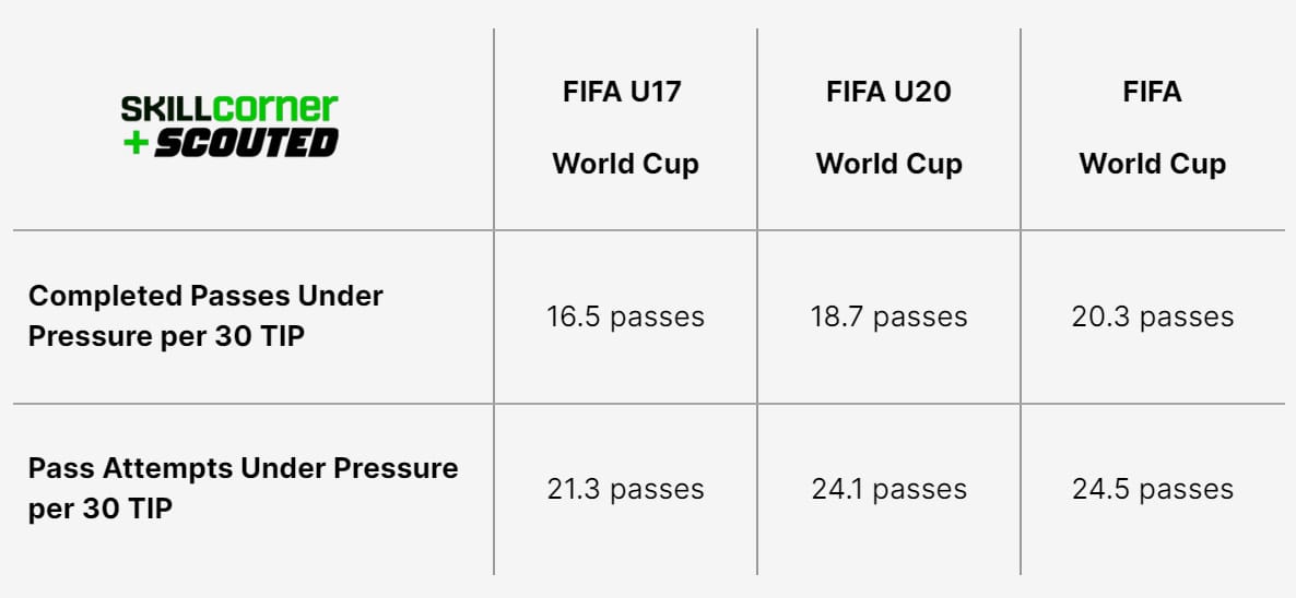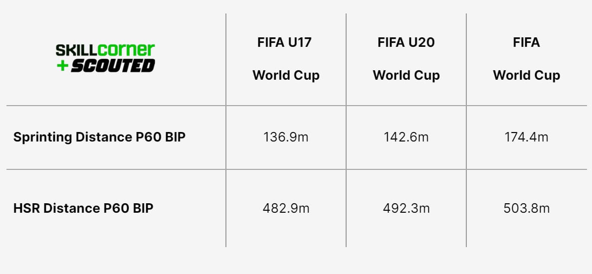 To examine and illustrate that gap, I dug into Under-17, Under-20, and men’s World Cups, and statistical trends from our data partners at SkillCorner. By using key metrics from SkillCorner’s four key categories — Physical Output, Overcoming Pressure, Passing, and Running Off-Ball — I’ll paint the picture of how the game changes as players grow.