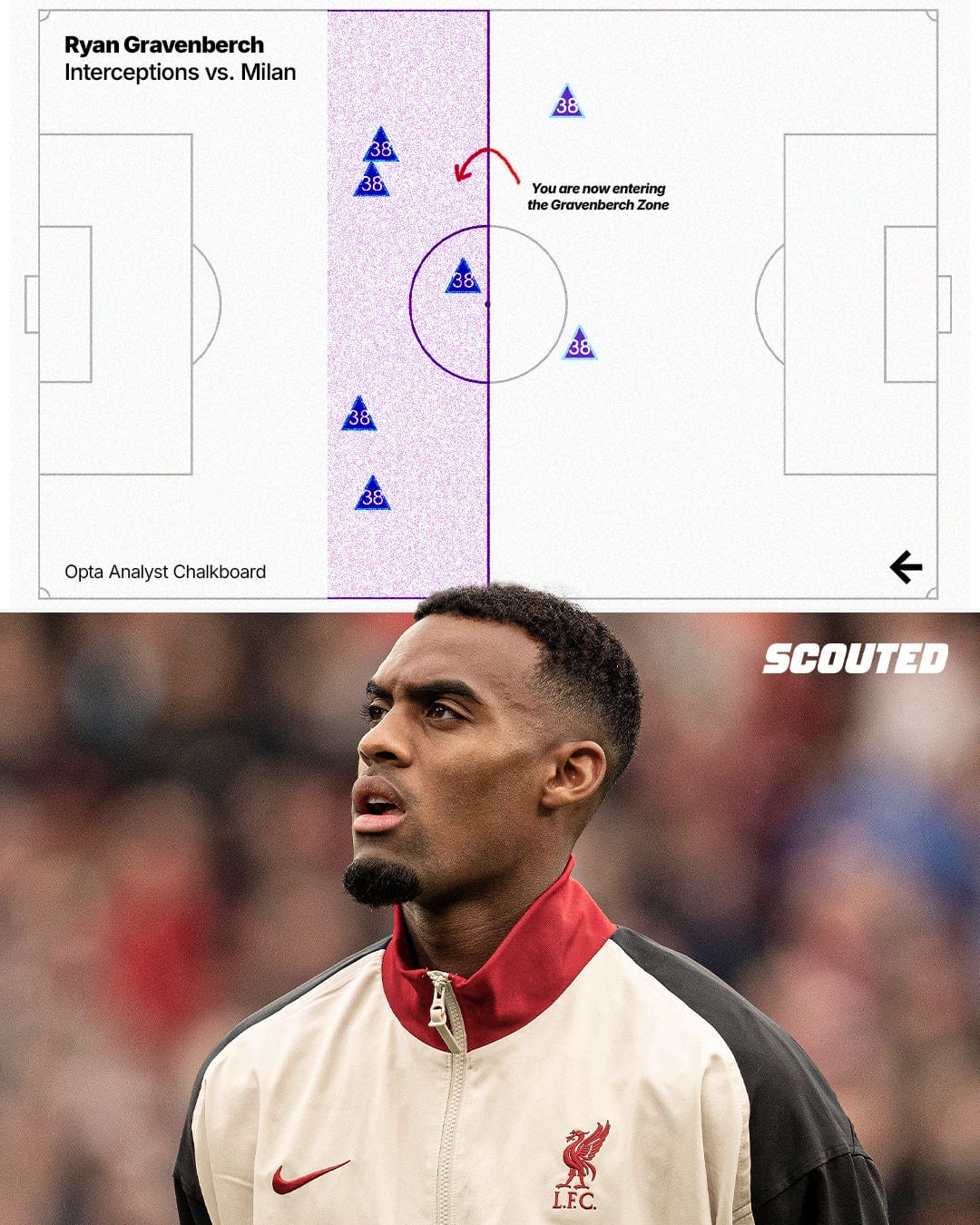 Ryan Gravenberch is in top spot for Interceptions, he made 7 against Milan. No Liverpool player has made more in a single UEFA Champions League game since the start of the 2016/17 season at least. Five of them were in the opposition half. This is quickly becoming his calling card.