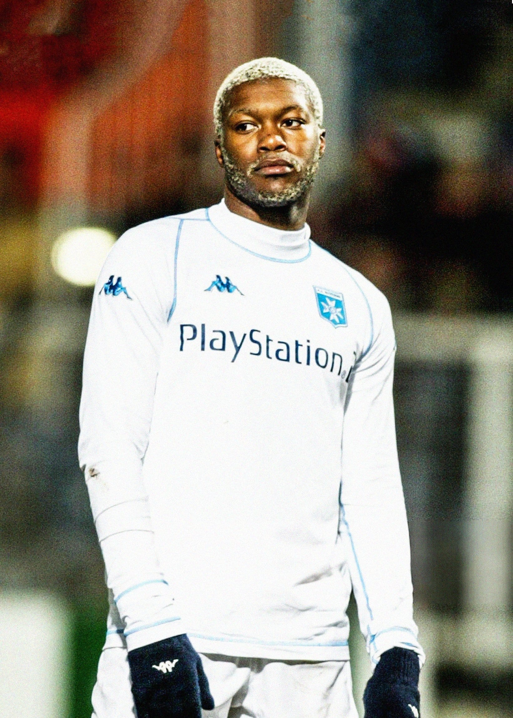 Here's Djibril Cissé in an all-white, long-sleeved Auxerre x Kappa kit with a PlayStation sponsor in the early 2000s. You're welcome.